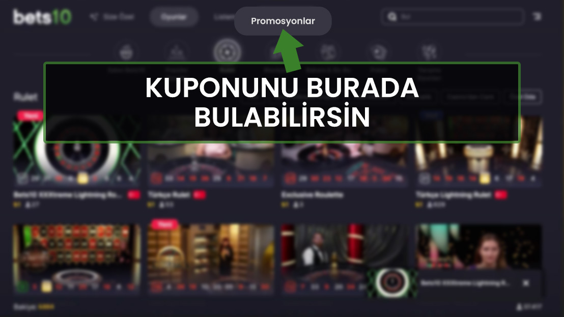 Lobiye gittikten sonra göreceğin menü seçeneklerinden "Promosyonlar"a tıkladıktan sonra Bets10'dan aldığın bu kuponu ve hangi oyunda kullanabileceğini görebilirsin.